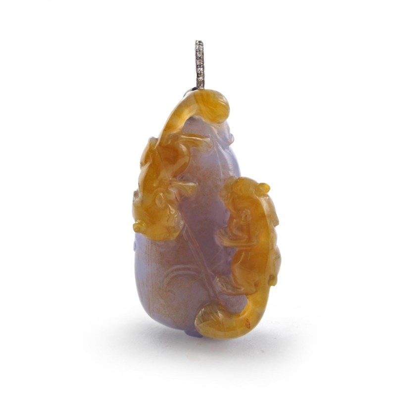 An unusual Chinese chalcedony pendant 19th century, carved in high relief with two shrews on a fruit, the reverse with a large leaf, the stone in tones of lavender, russet and white, with a silver coloured metal and diamanté mount, 5.6cm.