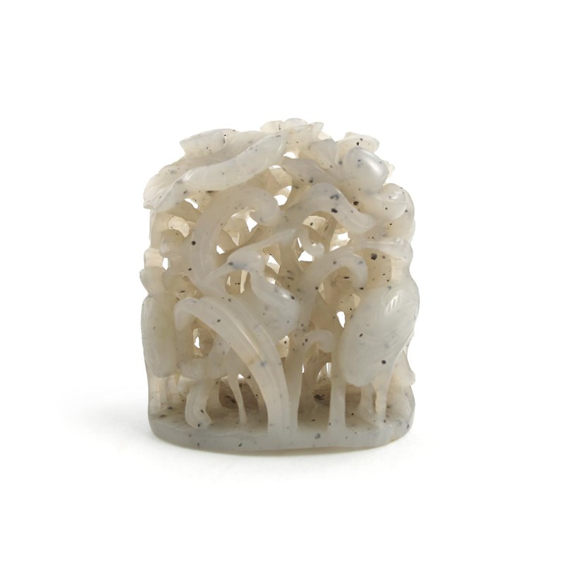 A Chinese pale celadon reticulated jade finial probably Ming dynasty, carved with six cranes amongst tall lotus, the stone with grey spotting, 5.6cm.