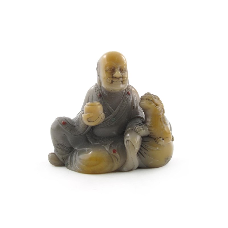 A Chinese soapstone figure of a luohan 18th century, recumbent, holding a begging bowl and with a Buddhist lion dog resting on a sack by his side, the stone inset with precious stones, 7cm.