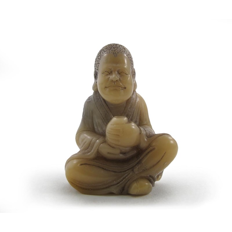 A Chinese soapstone figure of a luohan 18th/19th century, seated in a cross-legged position, wearing flowing robes with elaborate floral designs, and holding a small vase in his hands, 5.6cm.
