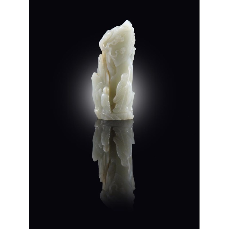 A fine Chinese pale celadon jade carving of a mountain Qianlong 1736-95, with a sage and his acolyte beneath an over-hanging cliff from which pine grows, the reverse with a waterfall and bamboo leaves, the stone with russet striations, together with a wood stand inlaid with silver wire, 10.4cm. (2) Cf. J Rawson, Chinese Jades from the Neolithic to the Qing, p.99 for a related boulder carving.