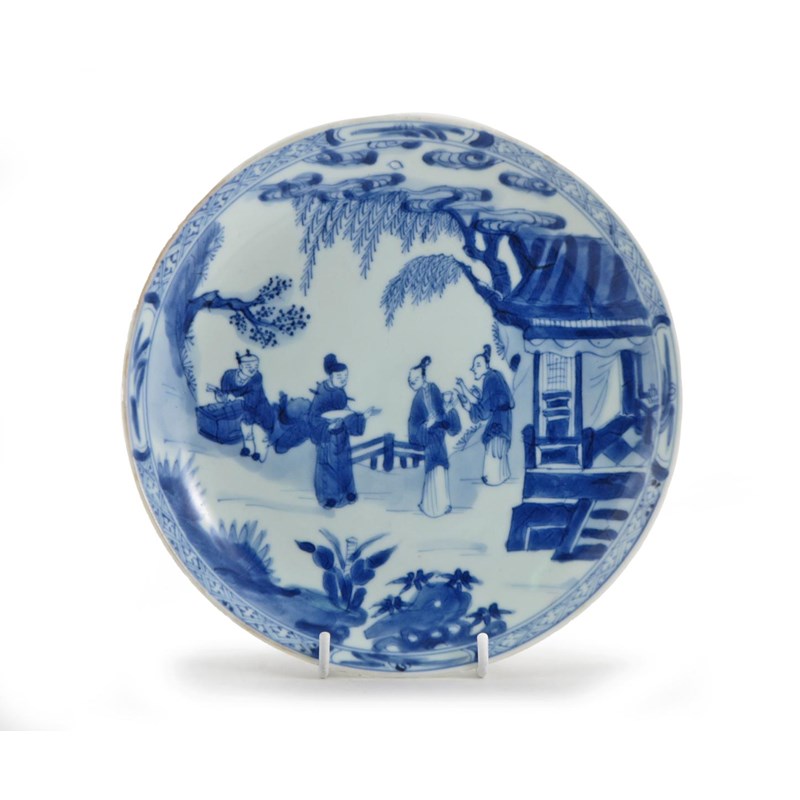 A Chinese blue and white dish six character Yongzheng mark and of the period 1723-35, painted with four figures in a fenced, rocky garden beneath willow and cloud scrolls, the rim with a band of geometric designs, chipping to the rim, 18.4cm.