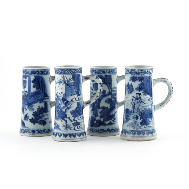 Four Chinese blue and white tall cylindrical mugs mid-17th century, each painted with figures in landscapes in various pursuits including hunting and receiving gifts, two with minor damages, 20.7cm. (4) Provenance: Invercauld Castle, Aberdeenshire.