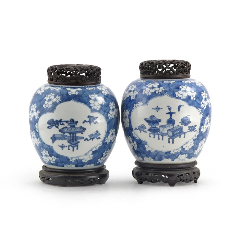 A pair of Chinese blue and white ovoid vases Kangxi 1662-1722, painted with panels of auspicious objects on a cracked-ice prunus ground, associated hardwood covers and stands, the covers damaged, 21cm. (6)