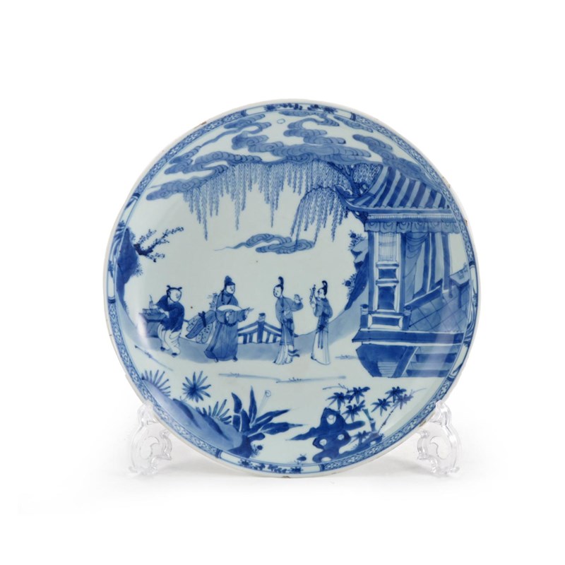 A Chinese blue and white dish six character Yongzheng mark and of the period 1723-35, painted with four figures beside a pagoda in a rocky fenced garden, beneath cloud scrolls and a willow tree, rim chips, pierced to the reverse for suspension, 26.8cm.