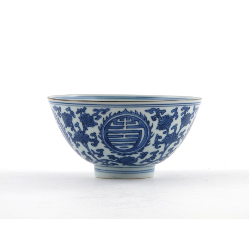 A Chinese blue and white medallion bowl mid-17th century, painted with five shou characters amidst stylized scrolling foliage, the base with a six character Jiajing mark, 14cm.