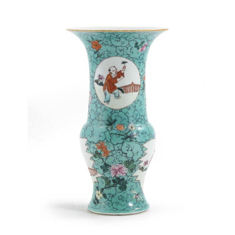 A Chinese small yen yen vase 18th century, painted in famille rose enamels with shaped panels of boys at play on a turquoise cloud ground decorated with flowers, the base turquoise, a rim crack, 24cm.