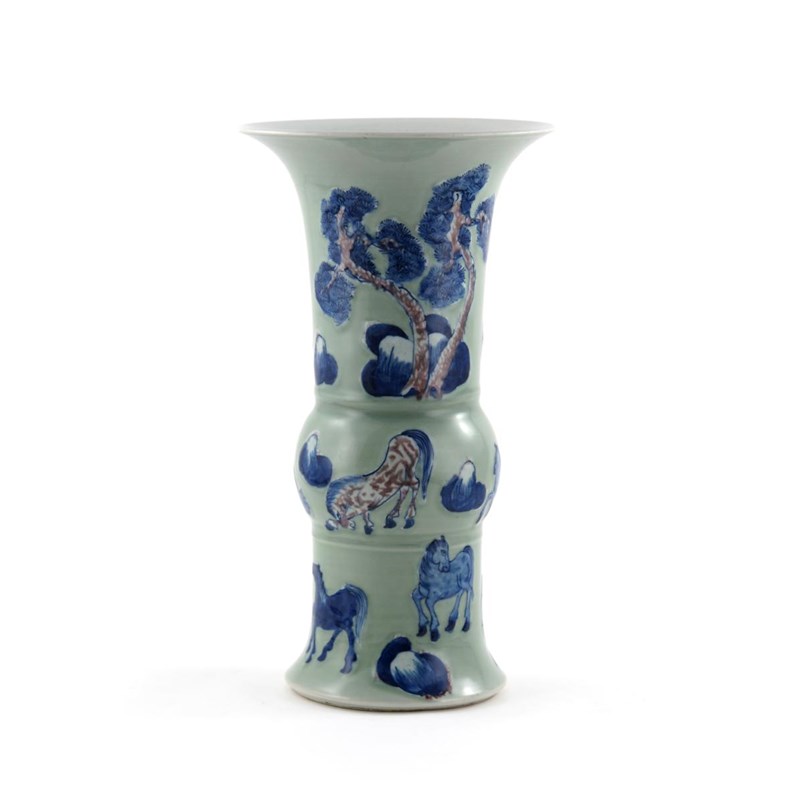 A Chinese celadon ground gu beaker vase 19th century, moulded and painted in underglaze blue and red with the eight horses of Mu Wang amidst pine trees and rocks, 43cm.