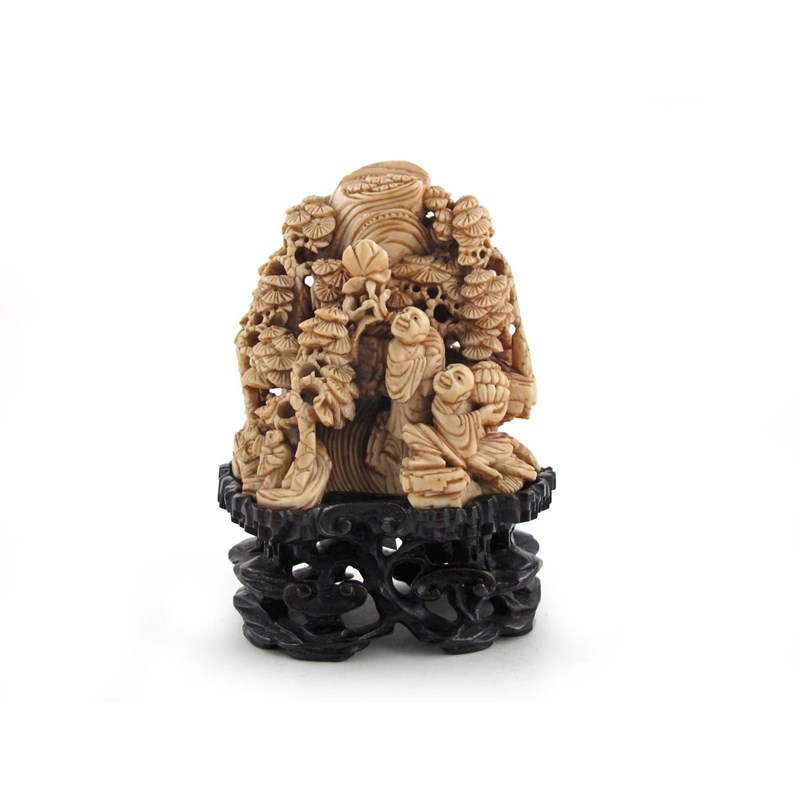 A Chinese ivory carving 19th century, depicting two large figures and several smaller beneath tall pine trees and a rocky outcrop, the reverse with two monkeys and pagodas, together with a reticulated wood stand, damage to the stand, 9cm. (2)