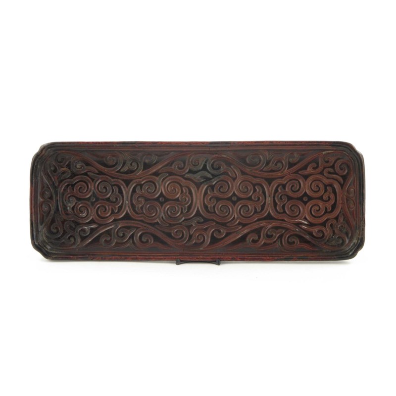 A rare Chinese tixi lacquer rectangular tray 15th/early16th century, finely carved through alternate layers of black and red lacquer, the upper surface with a stylized ruyi design, the reverse with further scroll work, all on a shaped foot, two character mark to the base, 37.1cm. Cf. S Kwan, Chinese Lacquer, no.60 for a similar tixi black lacquer tray which is dated to the mid-Ming.