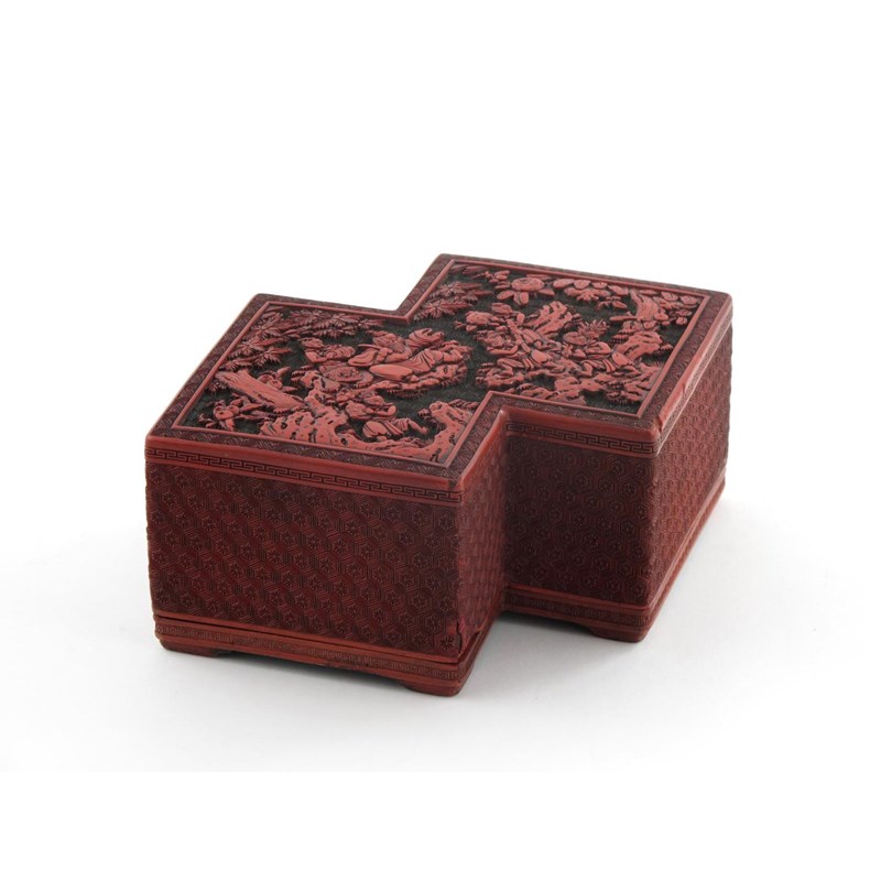 A Chinese red cinnabar lacquer box and cover 18th century, of conjoined rhomboid form, carved in relief with demons in a rocky forest, with pomegranates and a mythical creature, the sides with a floral diaper ground, minor damages, 22.7cm. (2)