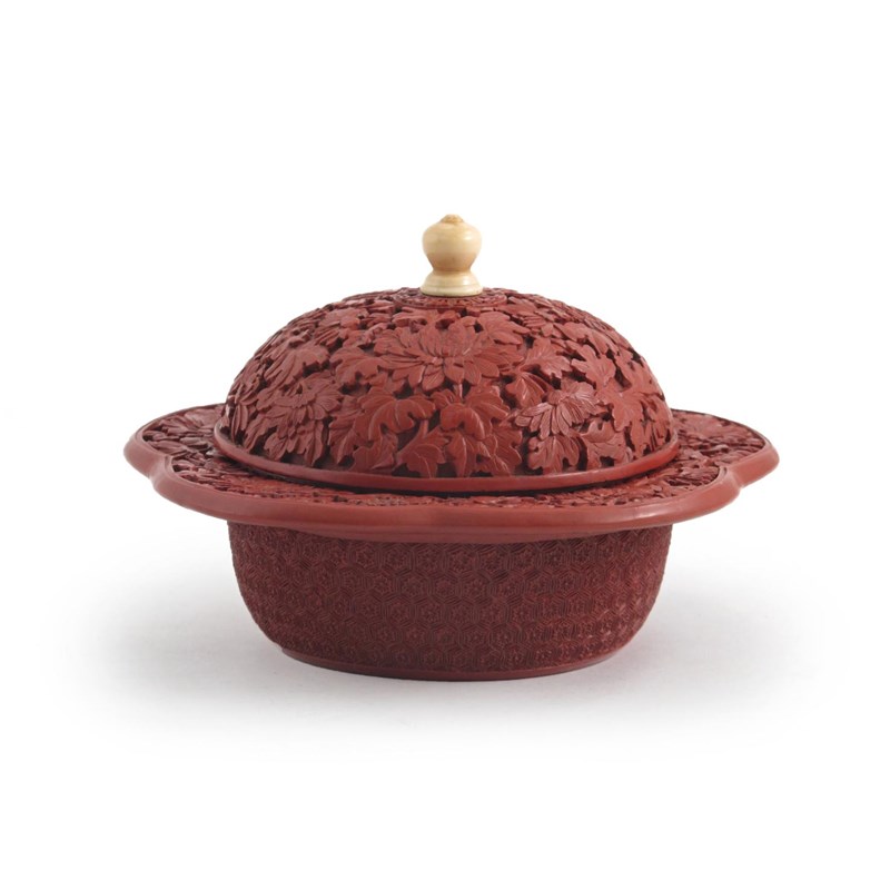 A Chinese hexafoil cinnabar lacquer box and cover 18th/19th century, carved in relief with peony, chrysanthemum and scrolling foliage with a geometric flower design to the base, the finial in ivory, the lacquer professionally cleaned and restored, 15.2cm. (2)