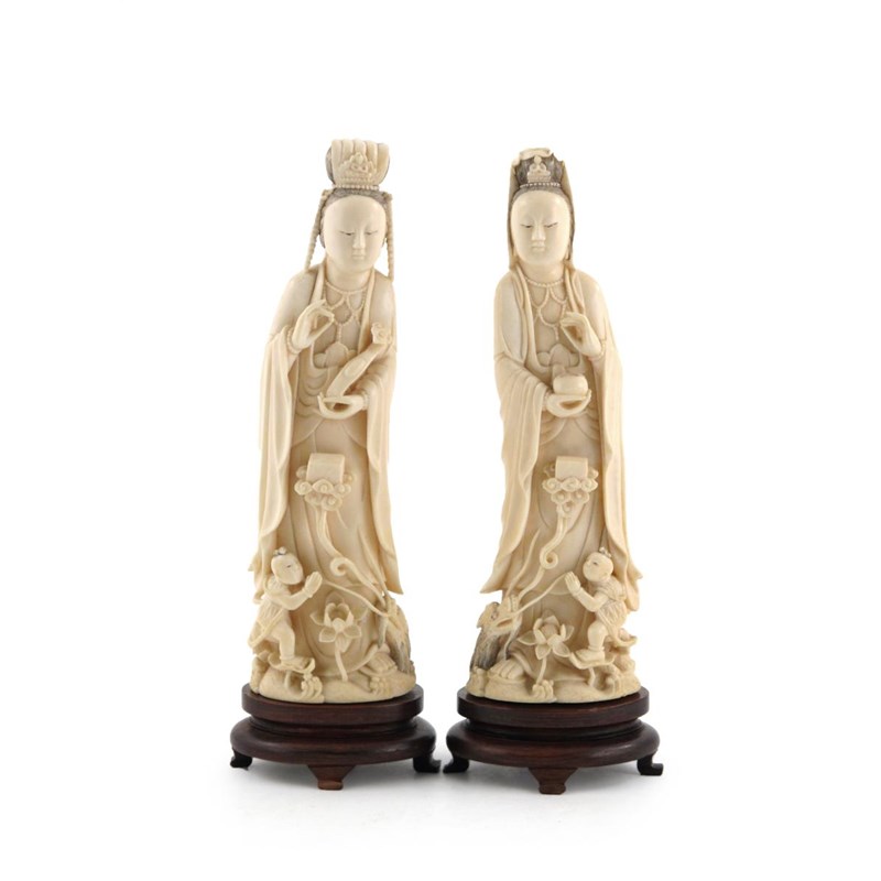A pair of Chinese ivory figures of Guanyin 19th century, each standing on lotus above scrolling waves with a writhing dragon and a small boy at her feet, one holding a ruyi sceptre, the other a small vessel, each on a hardwood stand, 27cm. (4)
