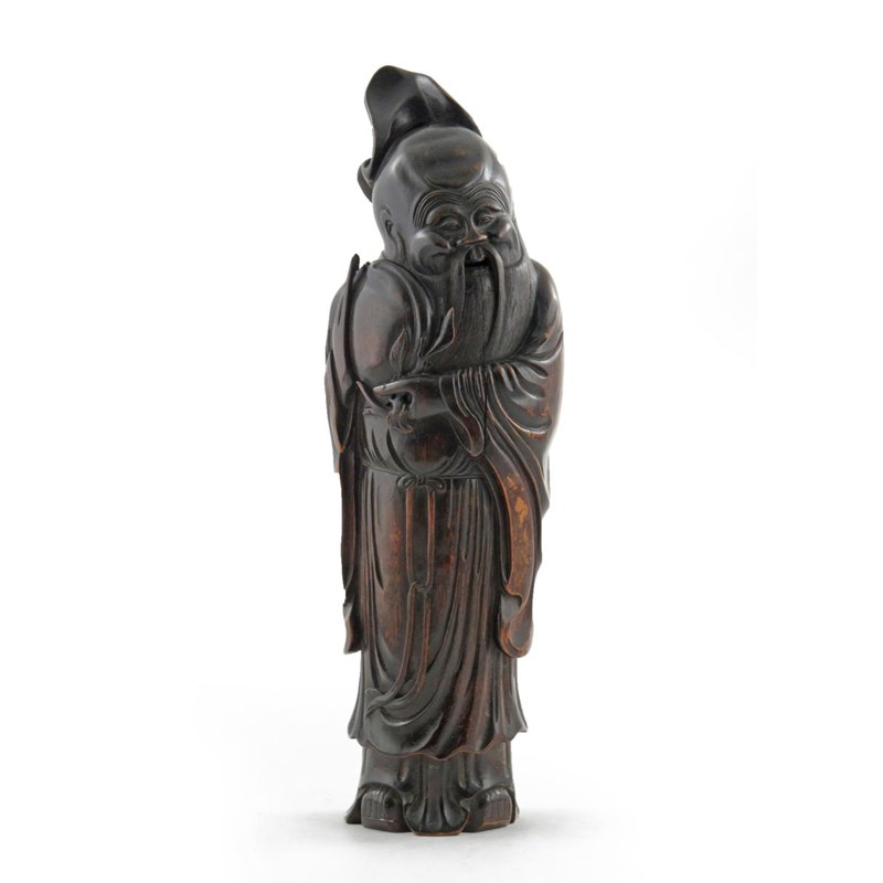 A large Chinese bamboo carving of Shoulao 19th century, standing wearing long flowing robes, carrying a large peach in his arms, 53.5cm.