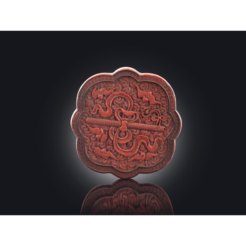 A Chinese red cinnabar lacquer box and cover 18th century, the cover decorated with five bats encircling a ribbon-tied baton on a scroll ground, the border with a key fret band, the sides with cell diaper designs, minor damages, 15.5cm. (2)