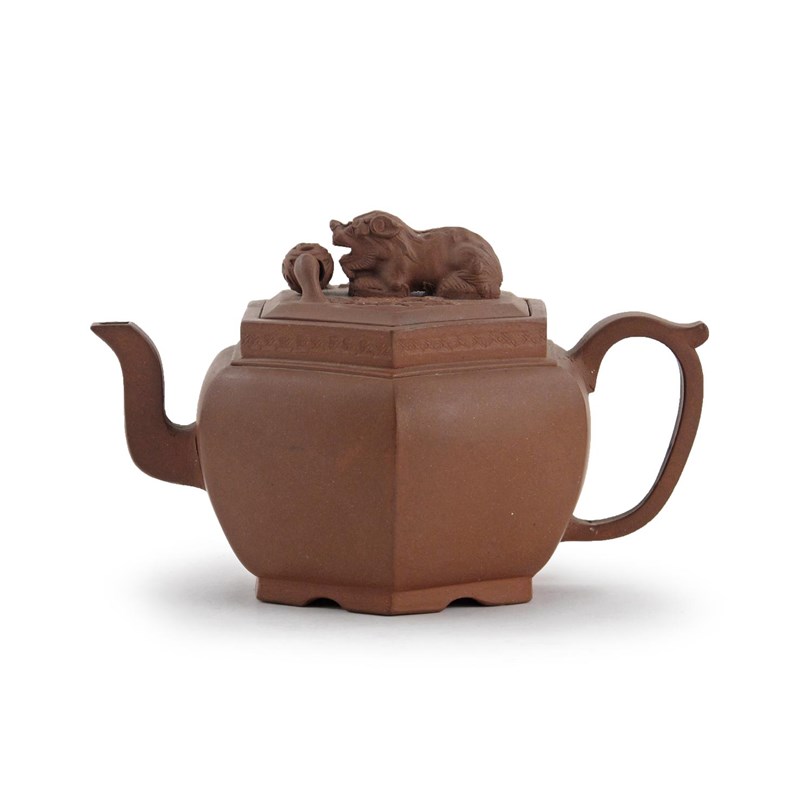 A Chinese Yixing teapot and cover 18th century, of hexagonal form, the cover with a lion dog and ball surmount, a seal mark to the cover, 21cm. (2)