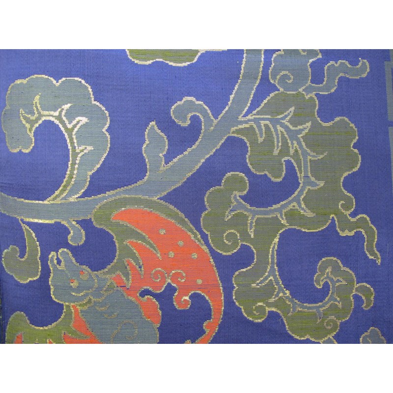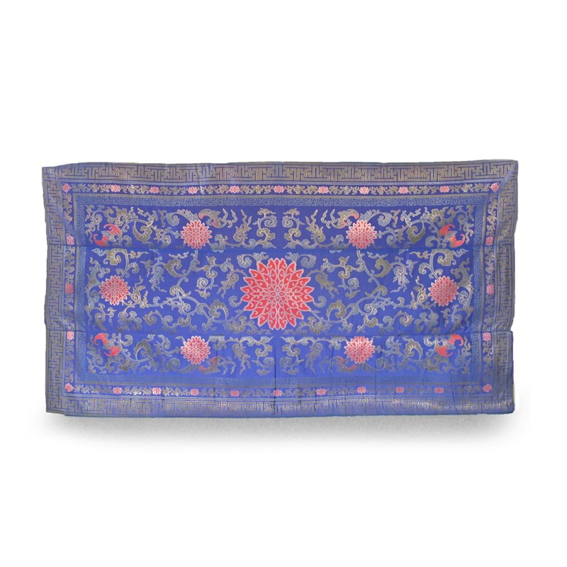 A large and fine Chinese blue ground woven silk panel mid-19th century, constructed in three parts, brightly decorated with a large central spiky flowerhead, and with six smaller growing from scrolling foliage, with bats hidden amidst the leaves, all within formal border designs of complex key fret, further flowers and foliage, the pattern in bright red, pink, and shades of green and gold, 335cm x185cm. Provenance: the Reverend Victor Farmer collection, 1898-1977.