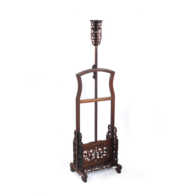 A Chinese hardwood lantern stand c.1900, with an adjustable stem, supported by a frame decorated with pierced, scrolling spandrels depicting dragons and flaming pearls of wisdom, the joints loose, 141cm. Cf. Imperial Furniture of The Ming and Qing Dynasties, Classics of The Forbidden City, p.317 for a related example.