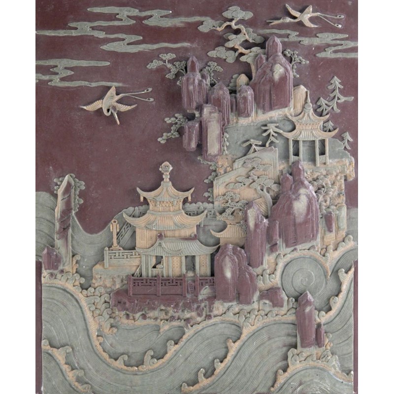 A Chinese duan stone panel 19th/20th century, carved in high relief with two cranes in flight above mountains, pagodas, rocks and scrolling waves, wear and small surface chips, 40.5cm.