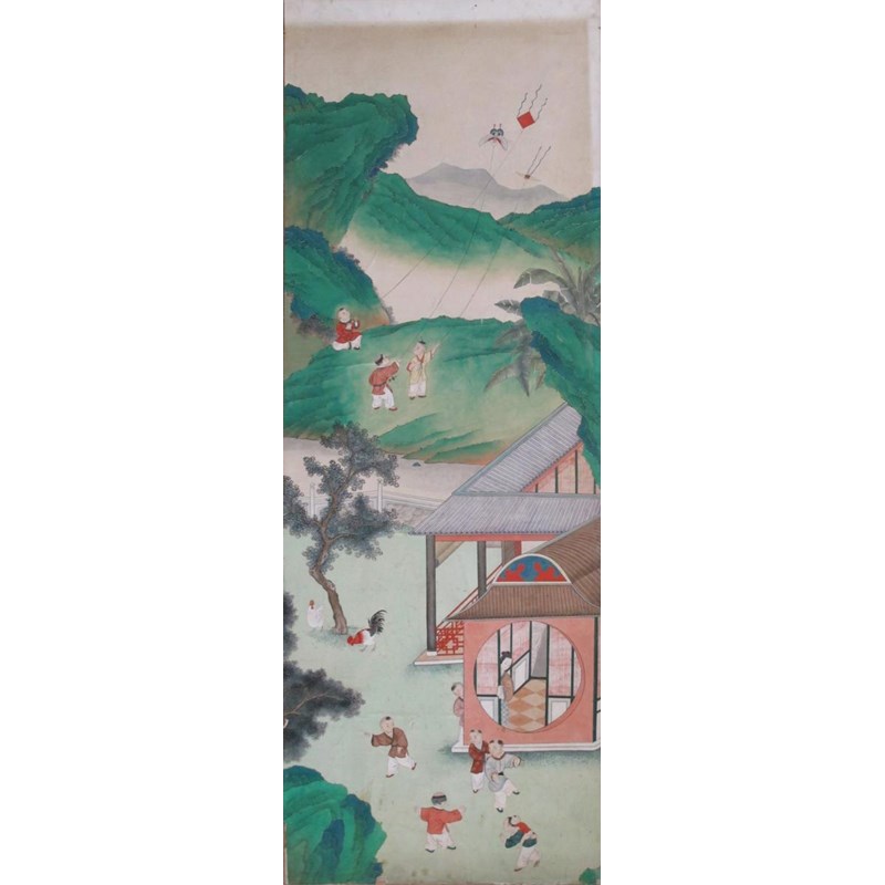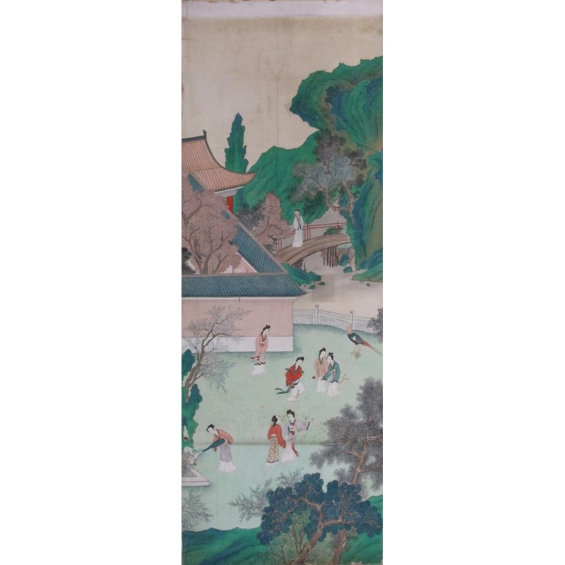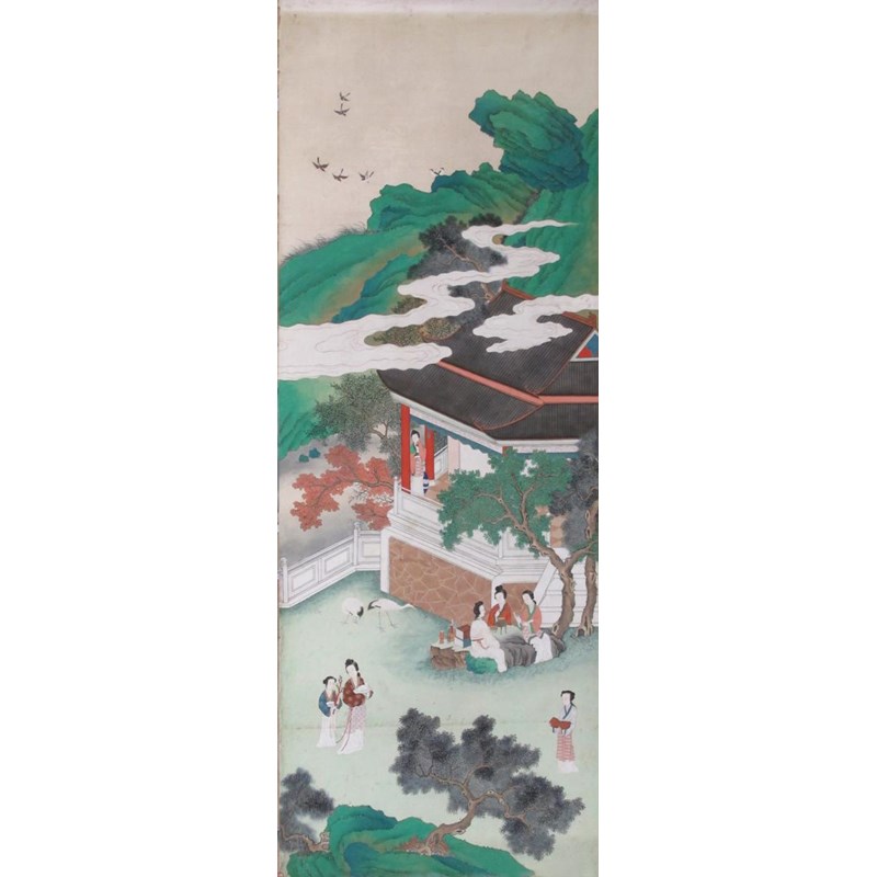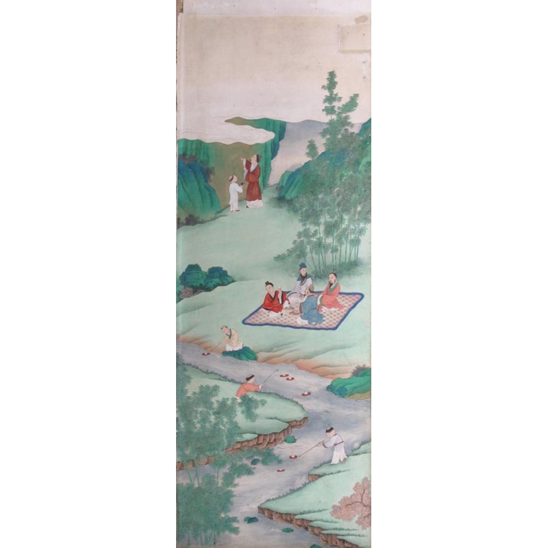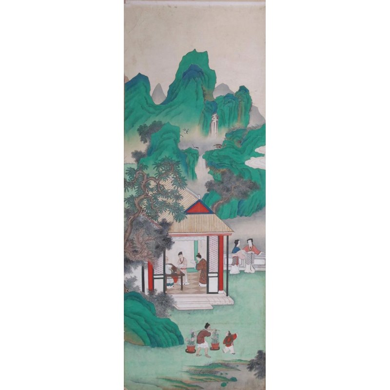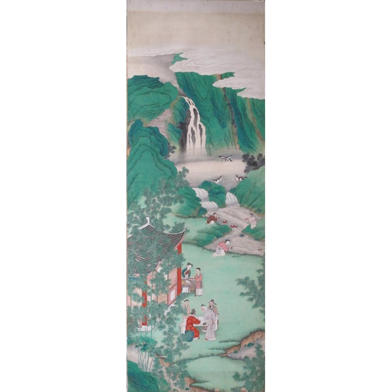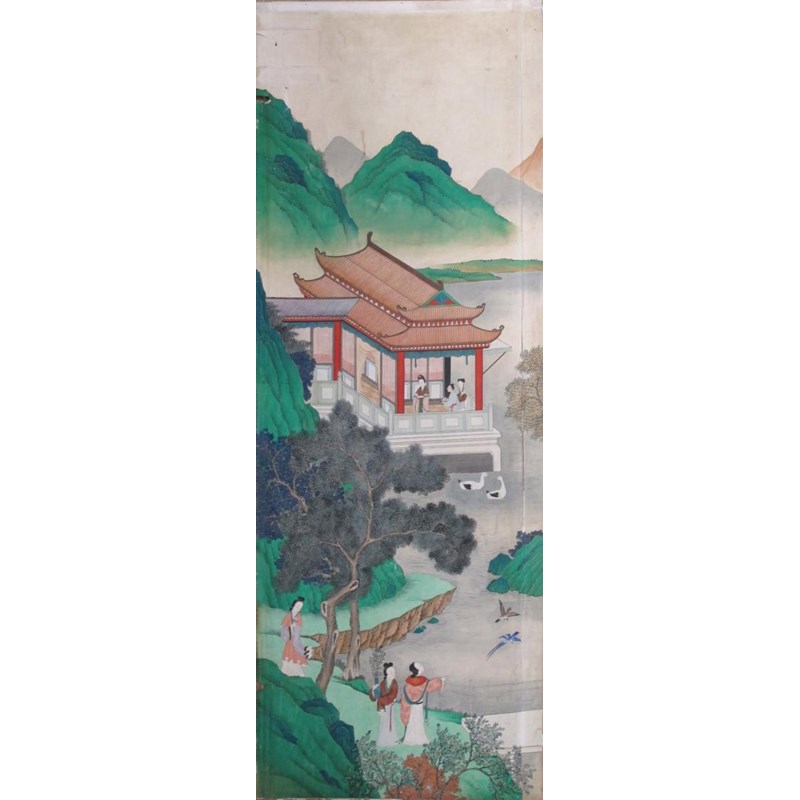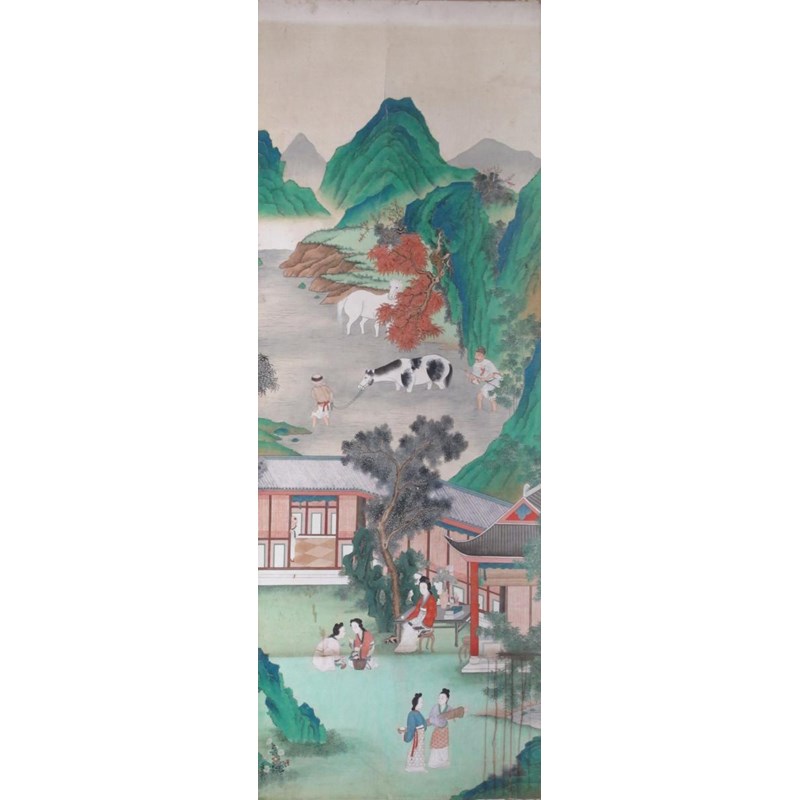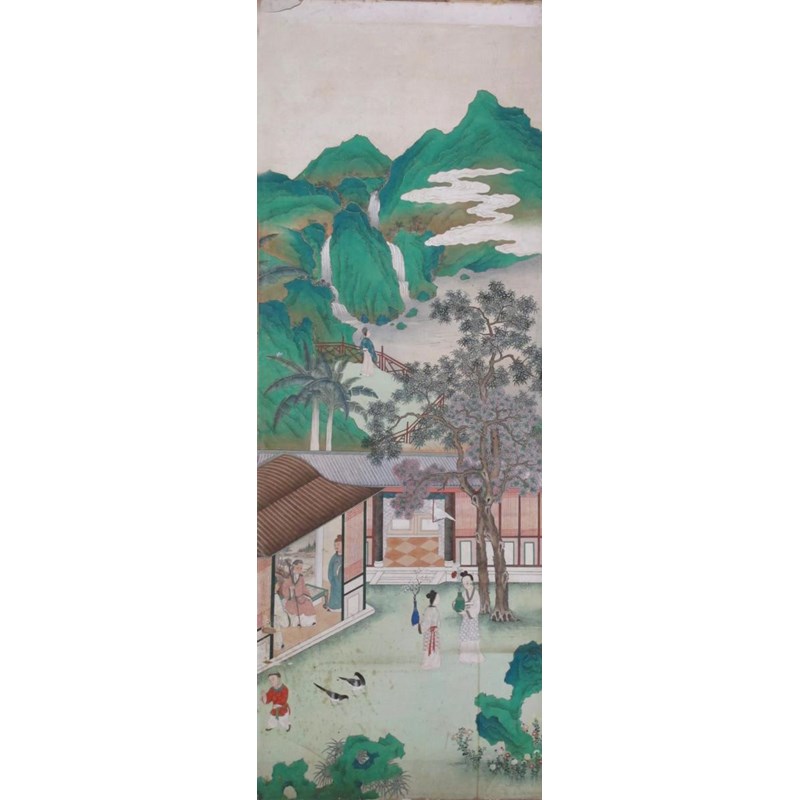 Twelve Chinese wallpaper panels 19th century, depicting a continuous scene of figures and animals in various pursuits amongst mountains and watery scenes, damages and wear, one with a section removed for a socket fitting, each panel approximately 328cm x 118cm each, 14.16m overall width. (12) Provenance: formerly Ashley Manor, King's Somborne, Hampshire.