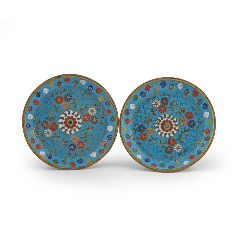A pair of Chinese cloisonné shallow dishes Qianlong 1736-95, each raised on three short lobed feet, decorated with a band of cloud scrolls encircling a central roundel of flowerheads and scrolling foliage, all on a turquoise ground, the candle spikes lacking, the feet misshapen and repaired, 13.4cm. (2)