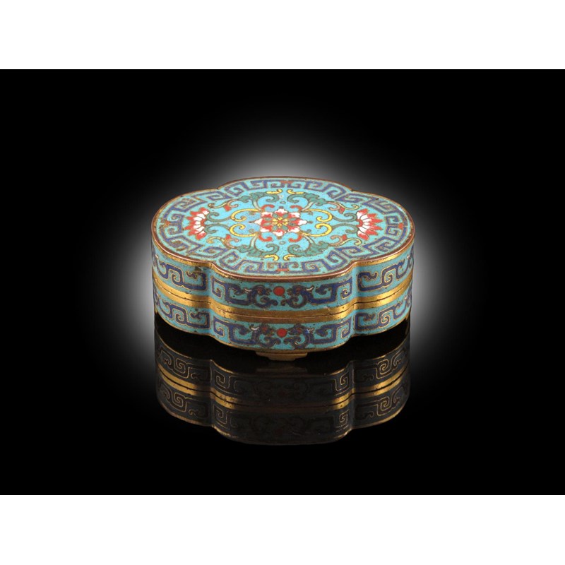A fine Chinese cloisonné box and cover Qianlong 1736-95, quatre-lobed and decorated with flowerheads and a scrolling key fret, with stylized dragons contesting pearls of wisdom, all on a turquoise ground, the base raised on four short bracket feet and with a further large flowerhead, wear to the gilding and enamels, 11.5cm. (2)