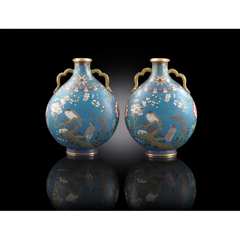 A pair of Chinese gilt bronze and cloisonné moonflasks 19th century, with flattened circular bodies and ruyi-shaped handles, each decorated with a pair of birds to one side and a large peony head to the other, each with a six character Qianlong mark, a little wear to the gilding, 27.2cm. (2) Provenance: formerly in the collection of Muftah Al Abbar, Monaco. Cf. Brown, Chinese Cloisonné: The Clague Collection, pl.12, 21 and 46 for related cloisonné moonflasks.