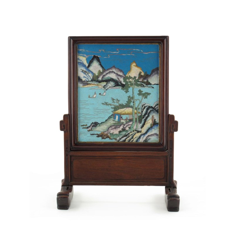 *A Chinese cloisonné table screen 18th/19th century, depicting two figures in a hut beneath trees on the shores of a lake, with two small sailing boats and mountains in the distance, mounted in a hardwood frame, the stand damaged and perhaps associated, 52cm. (2) Provenance: formerly in the collection of Muftah Al Abbar, Monaco.
