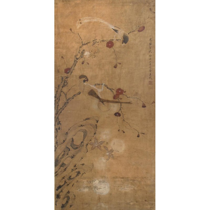 A Chinese scroll painting Kangxi 1662-1722, by Wang Wu (1632-90) painted with two long-tailed birds perched in flowering branches, a column of calligraphy and two red seals, 109cm x 52cm.