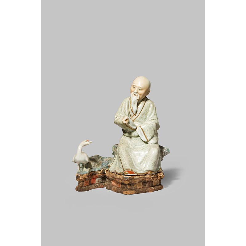 A CHINESE FAMILLE ROSE FIGURE OF WANG XI ZHI REPUBLIC PERIOD The calligrapher sits