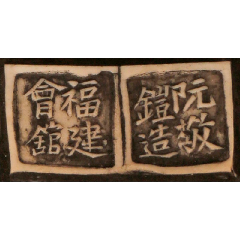The calligrapher sits, wearing a long green robe with a dense floral pattern, his head turned towards a goose to his left side, the base with two four character seal marks, one reading Ruan Jin Kai zao, the other Fu Jian hui guan, together with a stand, 16.5cm. (2)