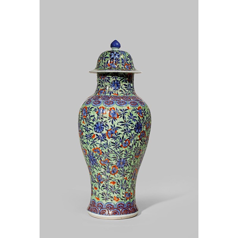 A CHINESE BLUE AND WHITE BALUSTER VASE AND COVER KANGXI 1662-1722 Painted with stylised foliage...