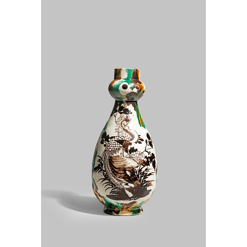 Decorated with splashes of green, yellow and brown, one side painted in brown with a phoenix standing upon a rock with floral sprays, 25cm.