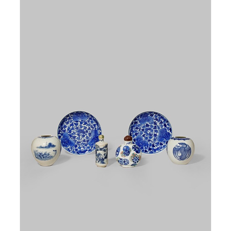 TWO CHINESE BLUE AND WHITE SAUCERS, TWO OVOID VASES AND TWO SNUFF BOTTLES