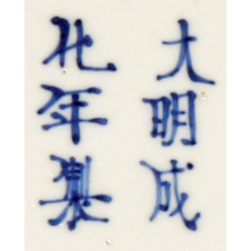 Decorated with three figures in a garden, together with a blue and white soft-paste shallow bowl decorated with a jardinière, the base with a six character Chenghua mark, 20cm. (2)