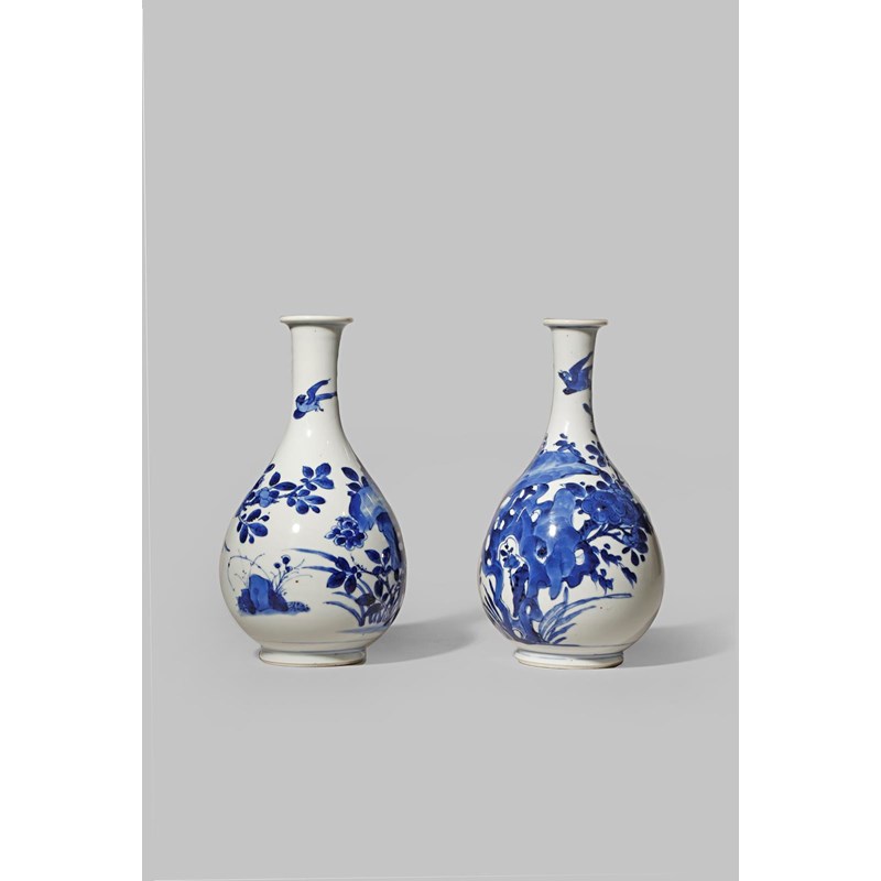 A PAIR OF CHINESE BLUE AND WHITE BOTTLE VASES KANGXI 1662-1722 With bulbous bodies raised on...