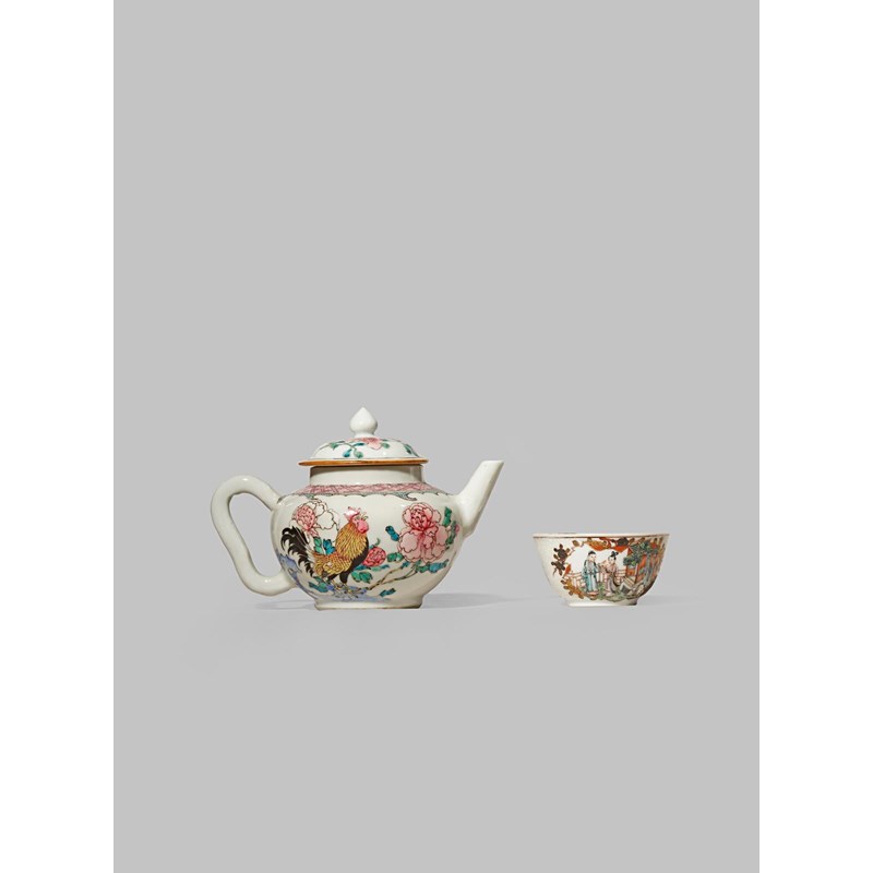 A CHINESE FAMILLE ROSE TEAPOT AND A COVER AND A TEA BOWL YONGZHENG 1723-35 The teapot painted on...