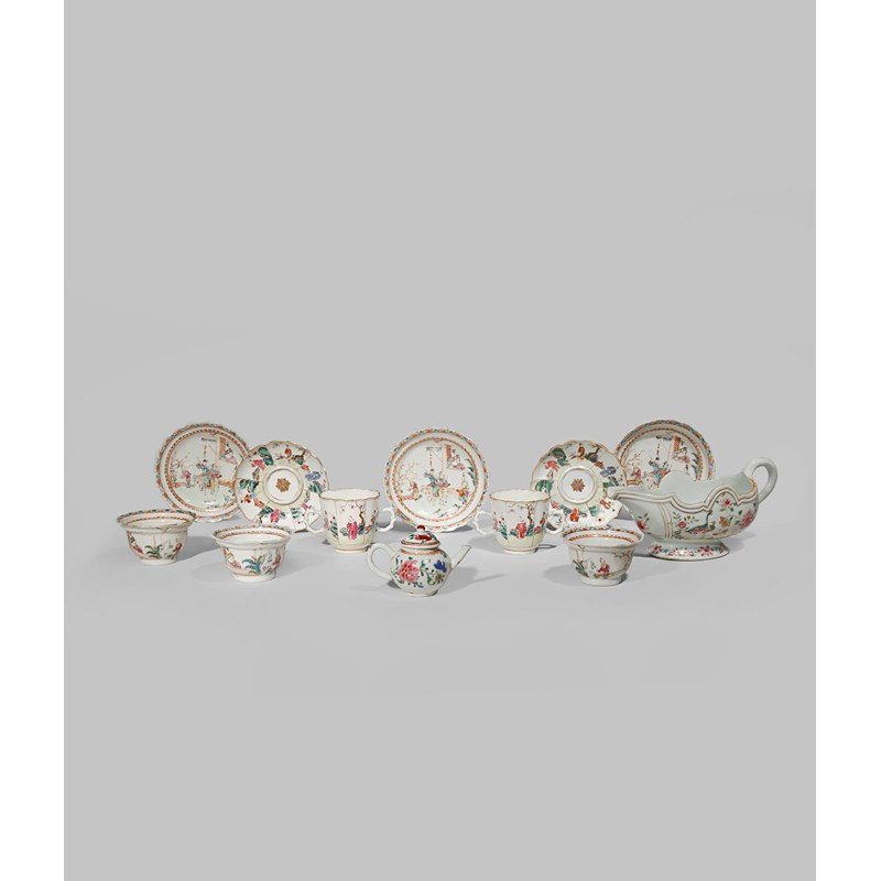 Comprising: three tea bowls and a pair of two-handled cups, all with saucers each decorated with figures in gardens, a sauce boat decorated with the twin peacock pattern and a miniature teapot and cover, 22.5cm. (13)