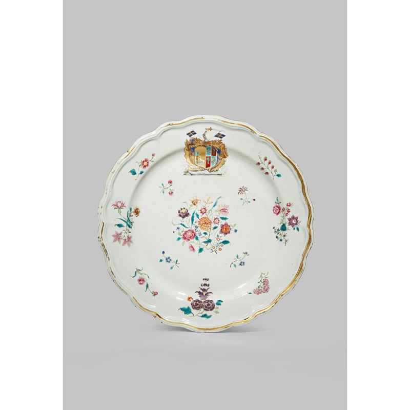 A LARGE CHINESE FAMILLE ROSE ARMORIAL PLATE FIRST HALF 18TH CENTURY Decorated with a rare...