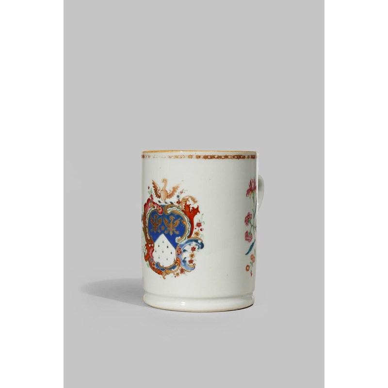 A CHINESE FAMILLE ROSE ARMORIAL MUG MID 18TH CENTURY The cylindrical body decorated with...