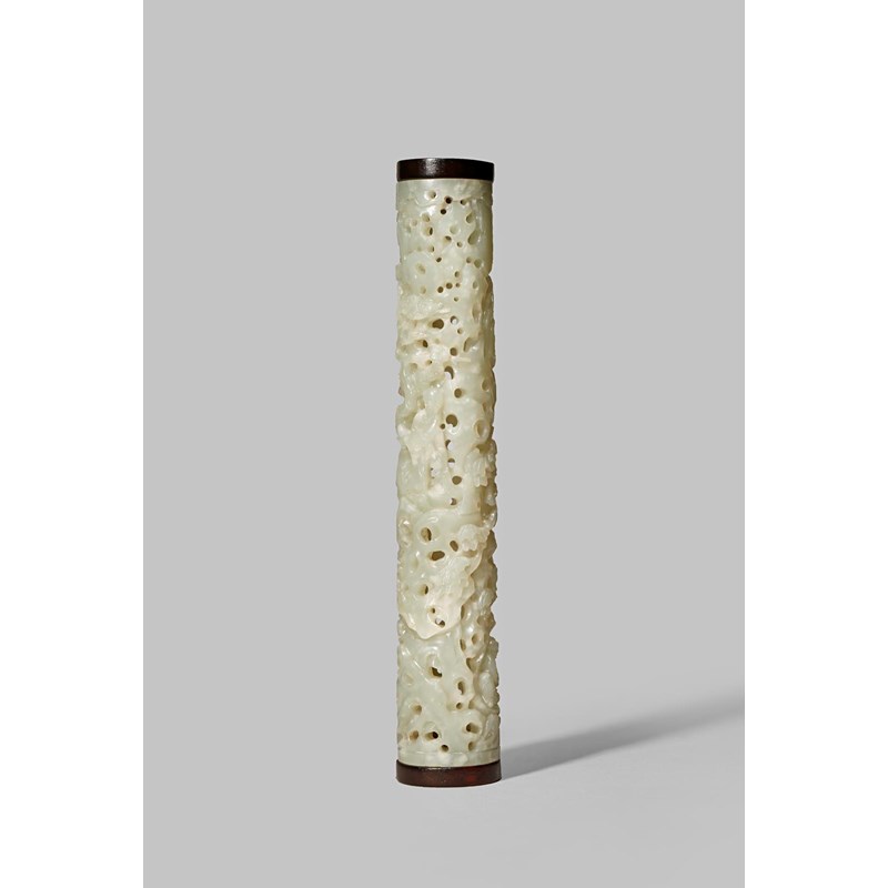 A CHINESE PALE CELADON JADE OPENWORK INCENSE HOLDER QIANLONG 1736-95 Carved with a scholar and an...