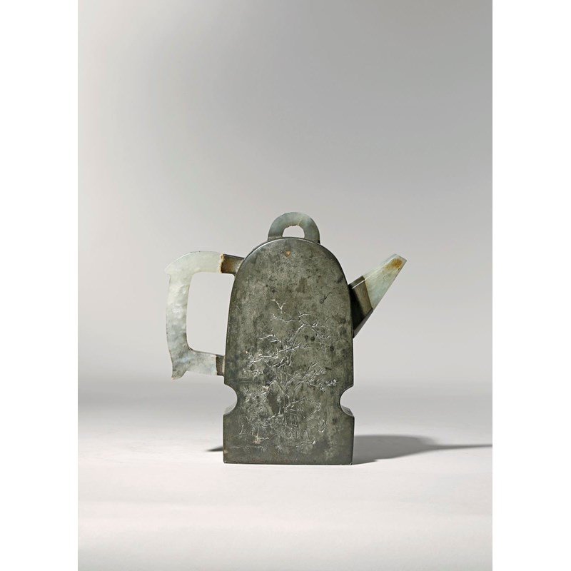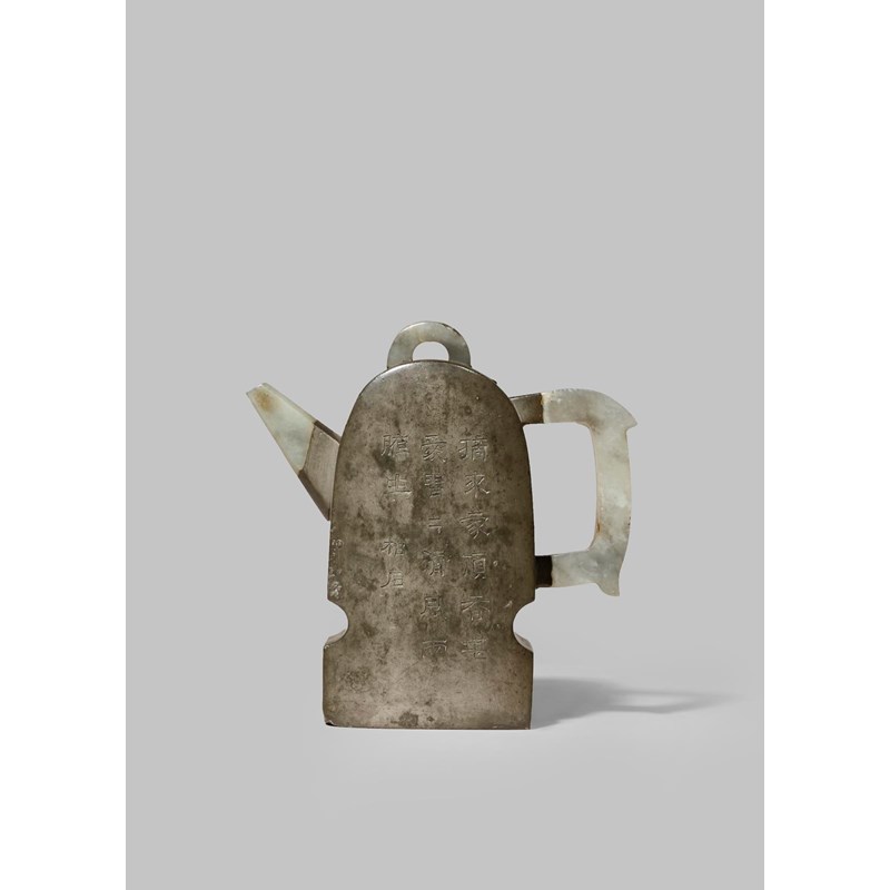 The body shaped as a qin, set with a jade spout, handle and knop, one side incised with bamboo and pine trees by a rock formation, the reverse with a poem, signed Bai Shi, 14cm. (2)