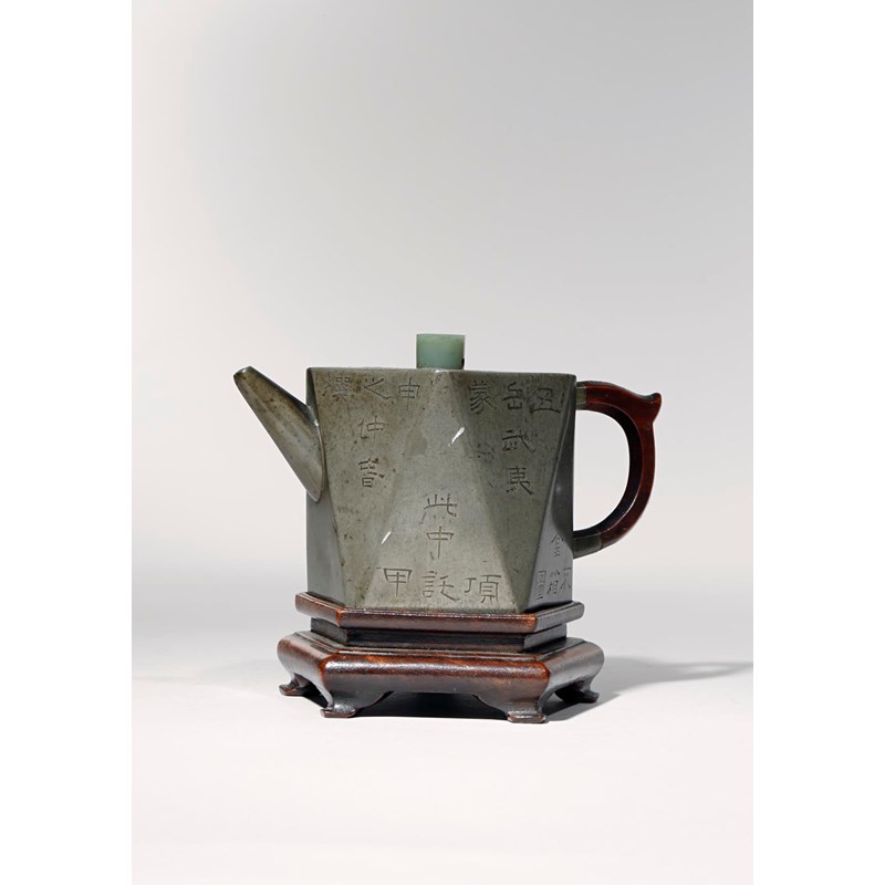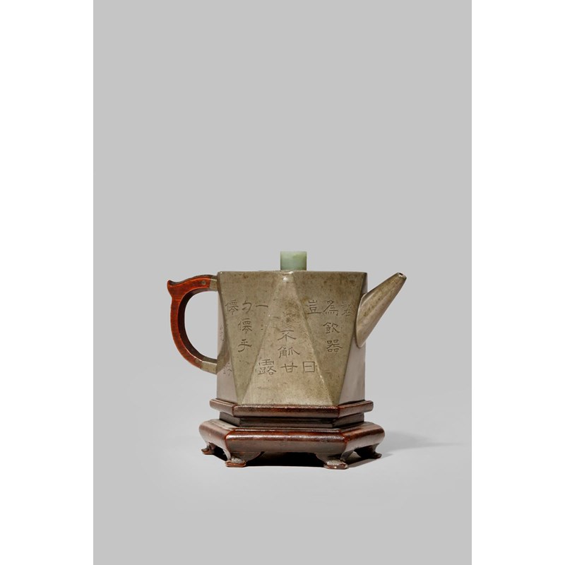The pentagonal body set with a C-shaped wooden handle with four characters inlaid with metal wire reading Shao Chang Hao zhi, the cover surmounted with a cylindrical jade knop, the sides incised with a poem about tea drinking inscribed by Fan Yu Tang, a single character Yue to the interior, together with a wood stand, 16cm. (3)
