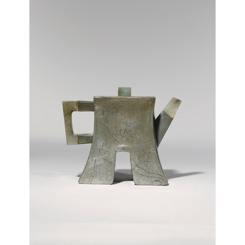 The coin-shaped body set with an angular C-shaped jade handle, a jade spout and knop, the sides incised with a blossoming prunus branch and a poem about prunus blossom and the moon, inscribed Er Quan, the interior with a seal mark which reads Fan Shu Zeng Zhi, 10.5cm. (2)
