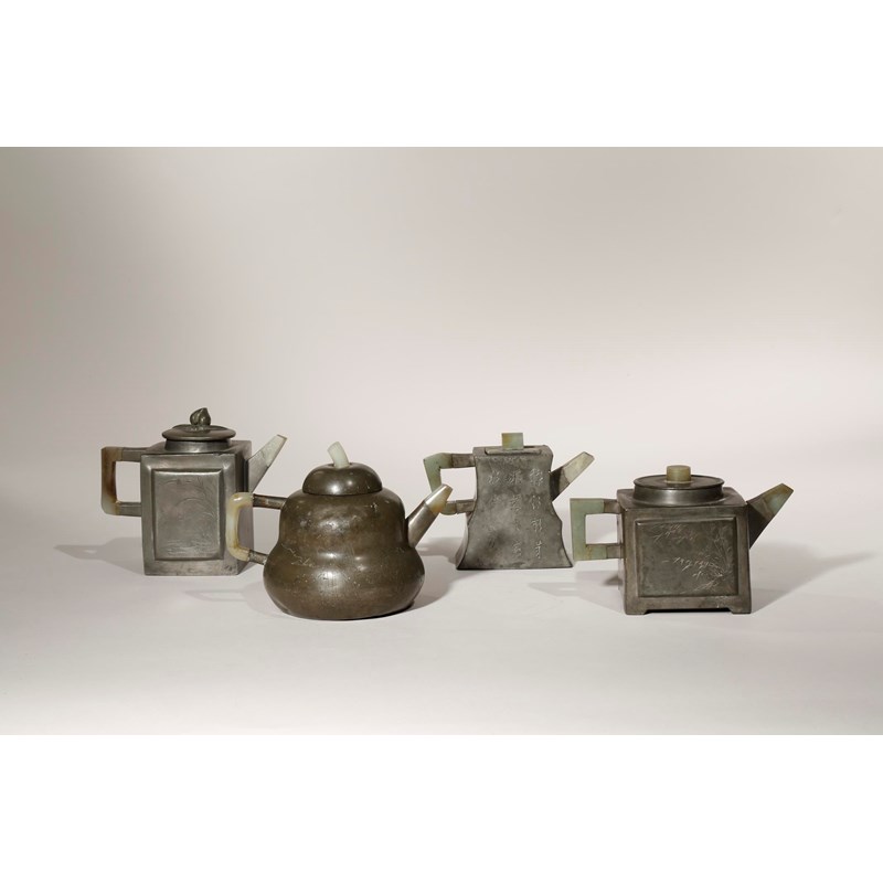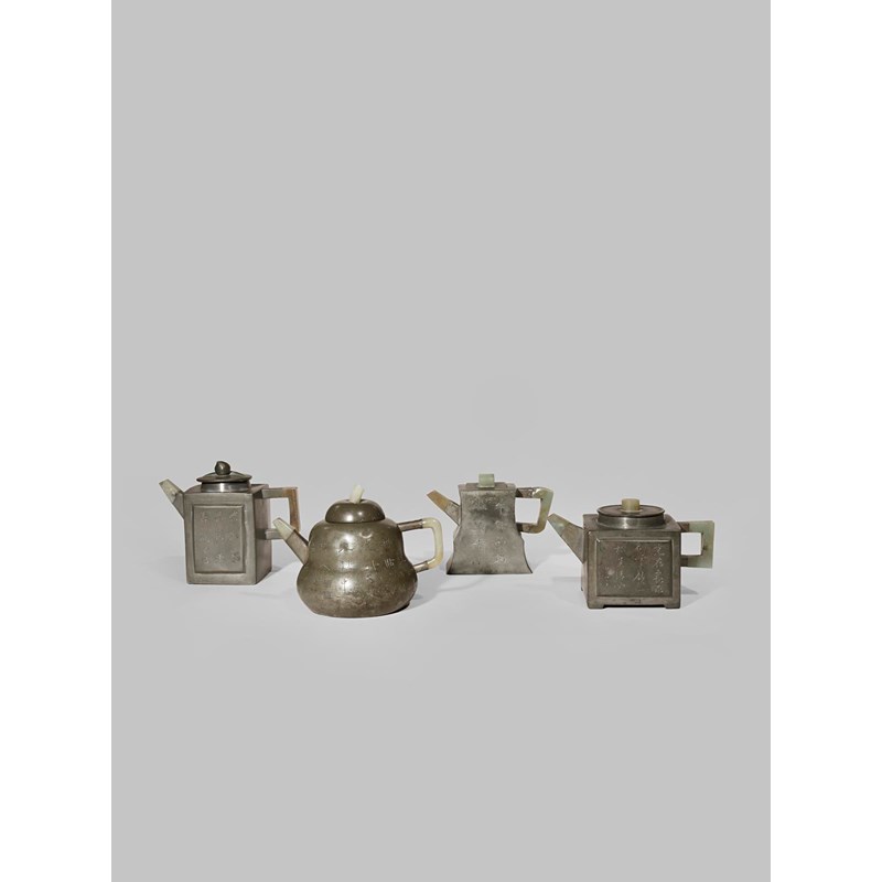 FOUR CHINESE INSCRIBED PEWTER AND PEWTER-ENCASED YIXING TEAPOTS AND COVERS QING DYNASTY Each set...