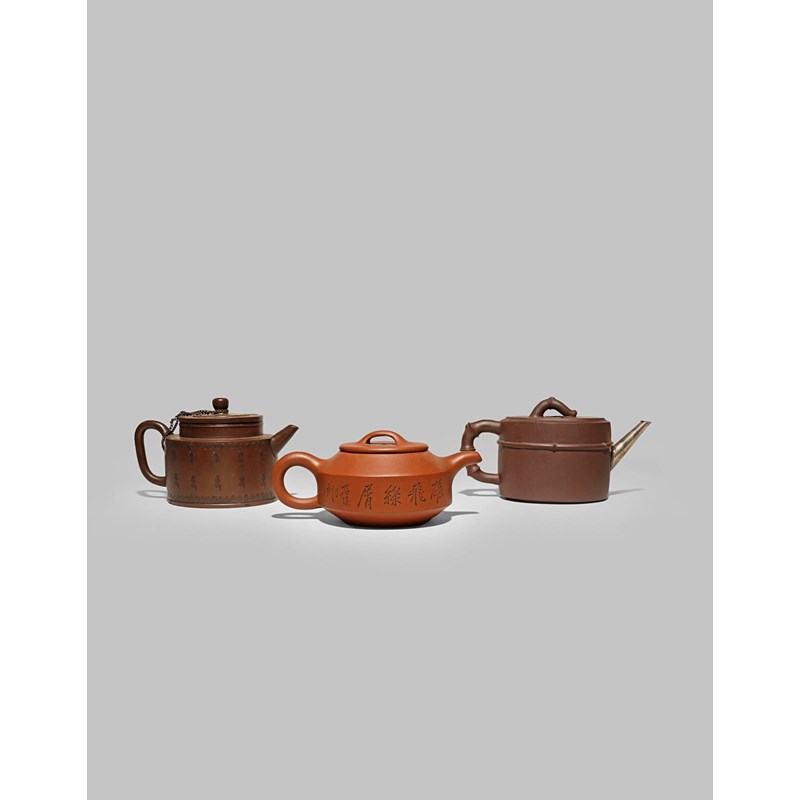 THREE CHINESE YIXING TEAPOTS AND COVERS QING DYNASTY Each decorated with calligraphy and with...
