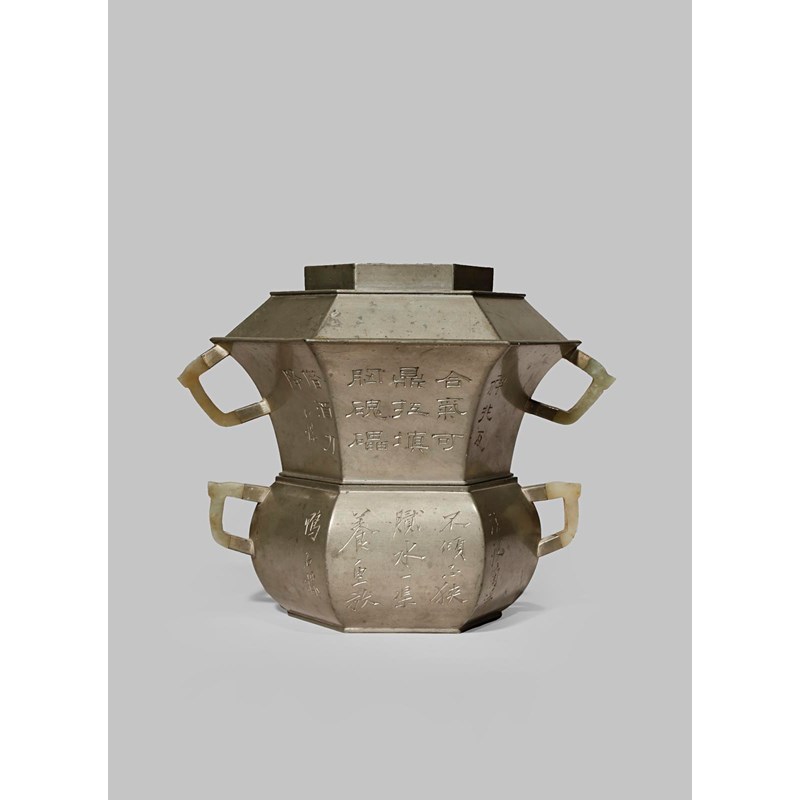Comprising: a water bowl, a food container and a cover also used as a tray, all of hexagonal shape. The two vessels set with angular C-shaped jade handles, the body incised with a bird on a branch of a willow tree and a spray of bamboo to one side, and inscribed with two poems by Zhu Shi Mei to the reverse, 18cm. (3)