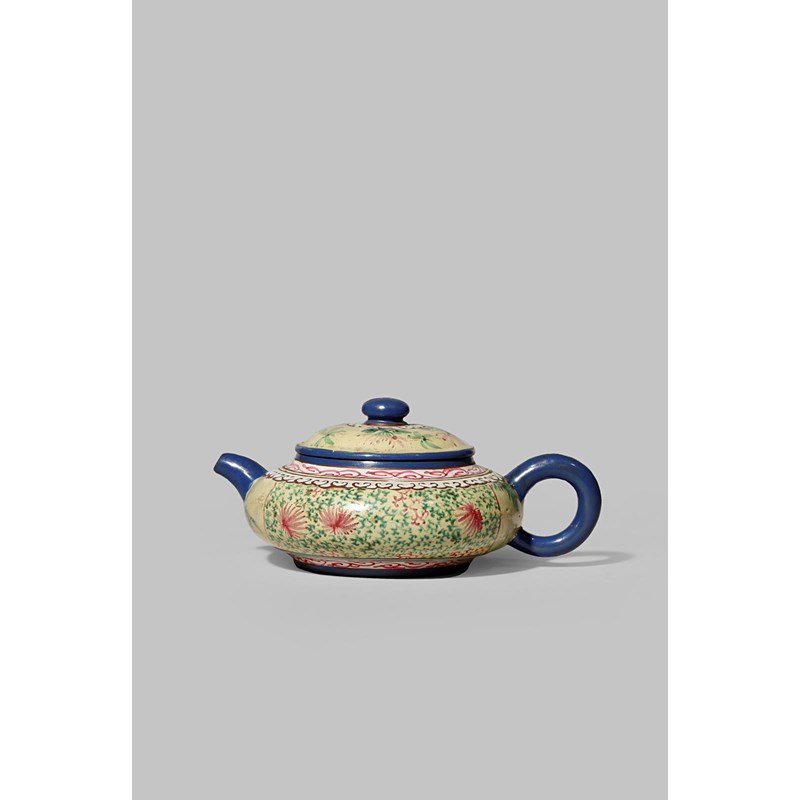 A CHINESE ENAMELLED YIXING TEAPOT AND COVER