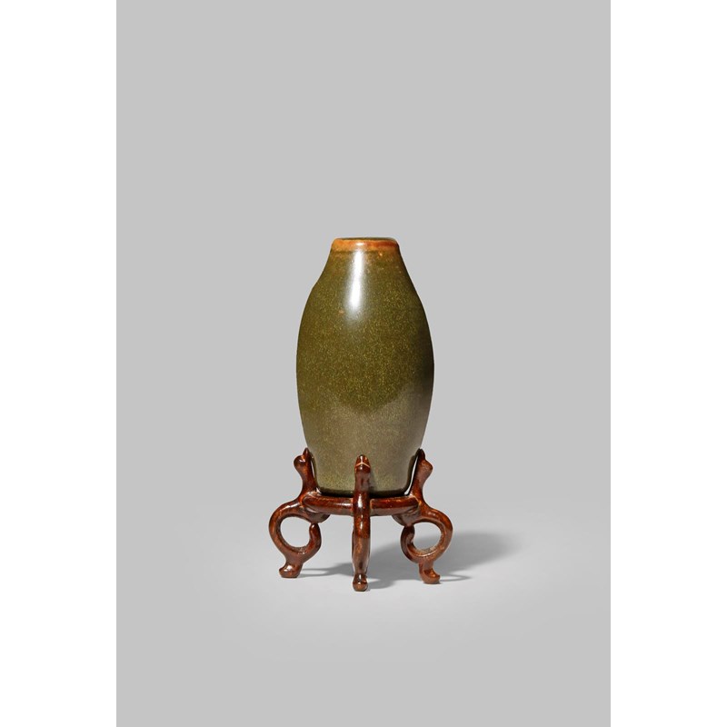 The ovoid body with a reddish-brown border to the top, together with a hardwood stand, 7cm. (2)