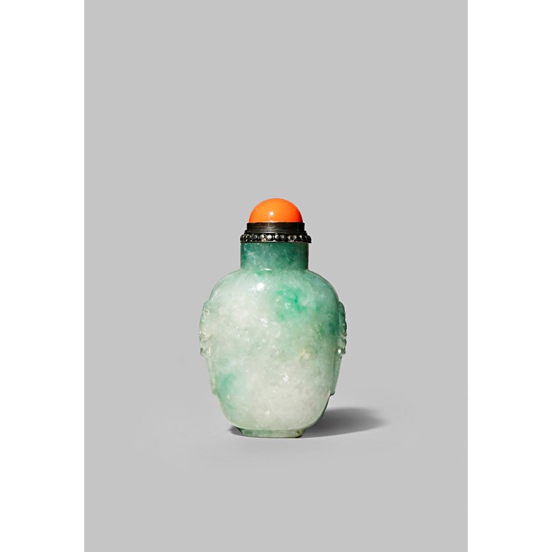 A CHINESE JADEITE SNUFF BOTTLE 19TH CENTURY With a flattened ovoid body with stylised lion-head...